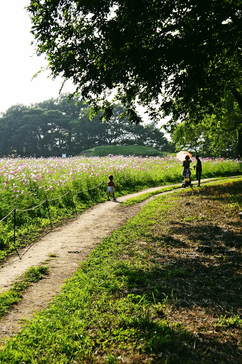 휴일을 즐기는 가족의 산책모습입니다..