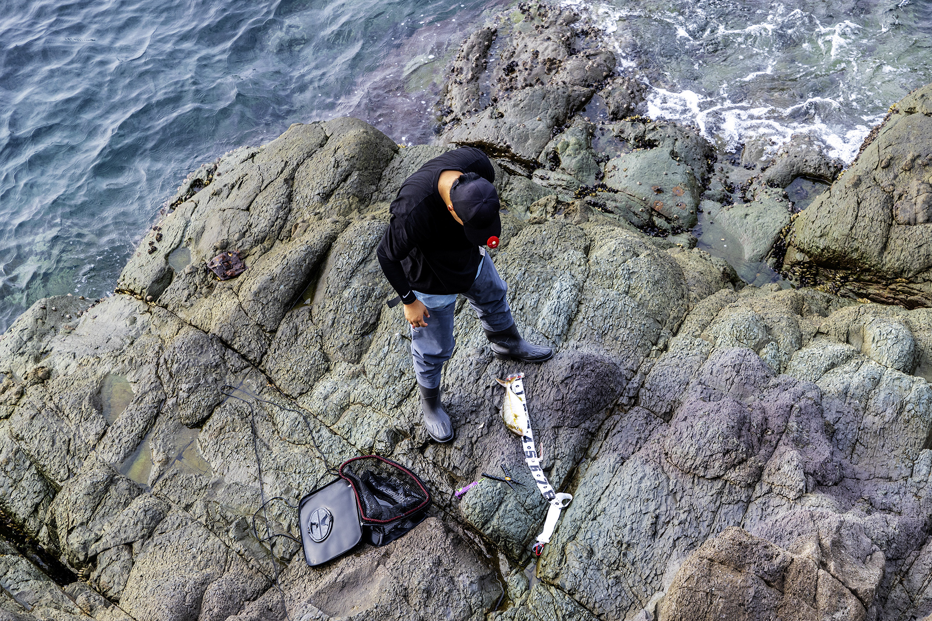 잿방어(?)를 잡아 크기를 재는 낚시꾼을 만났습니다.