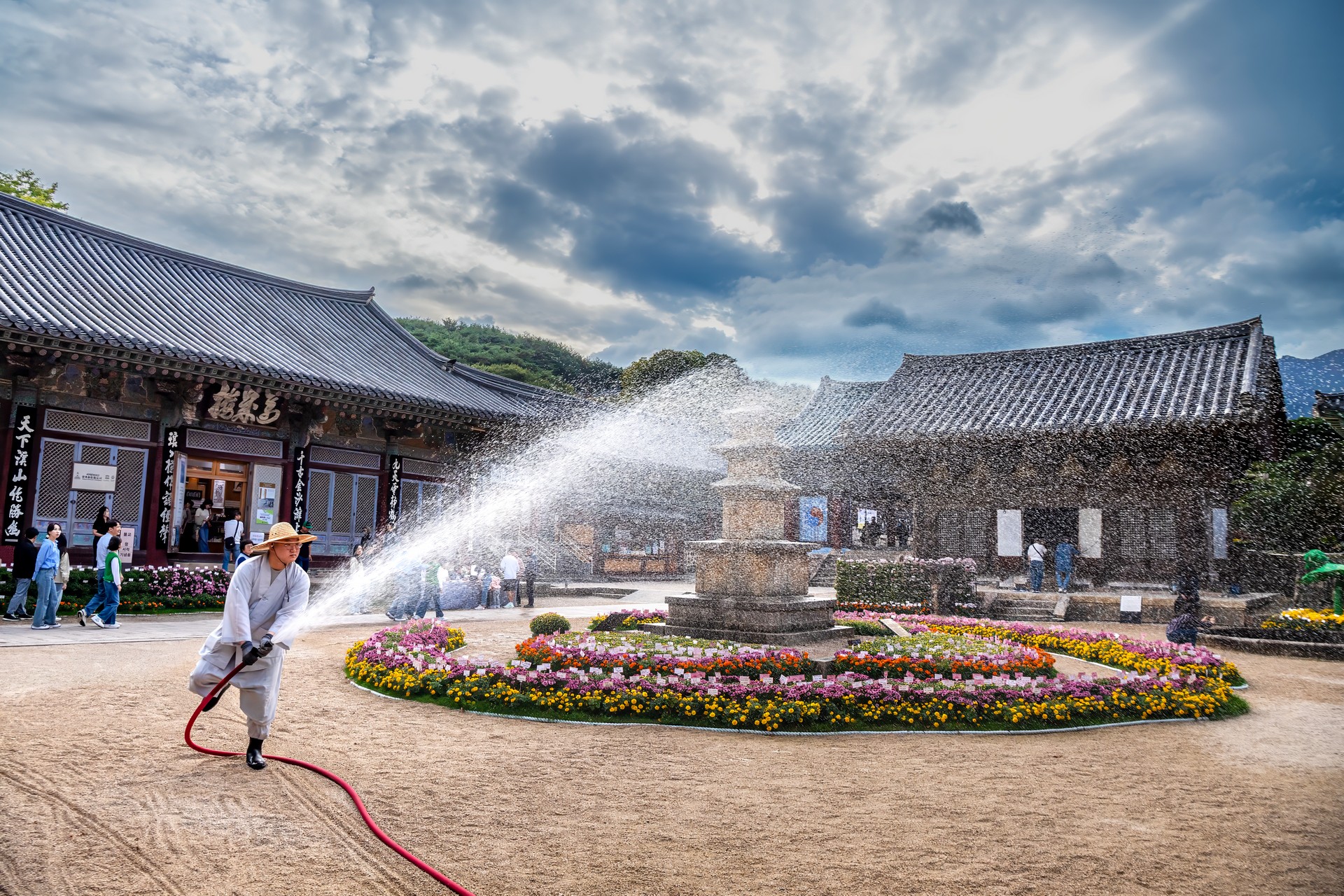 박력 넘치는 통도사 스님의 국화꽃에 물주기