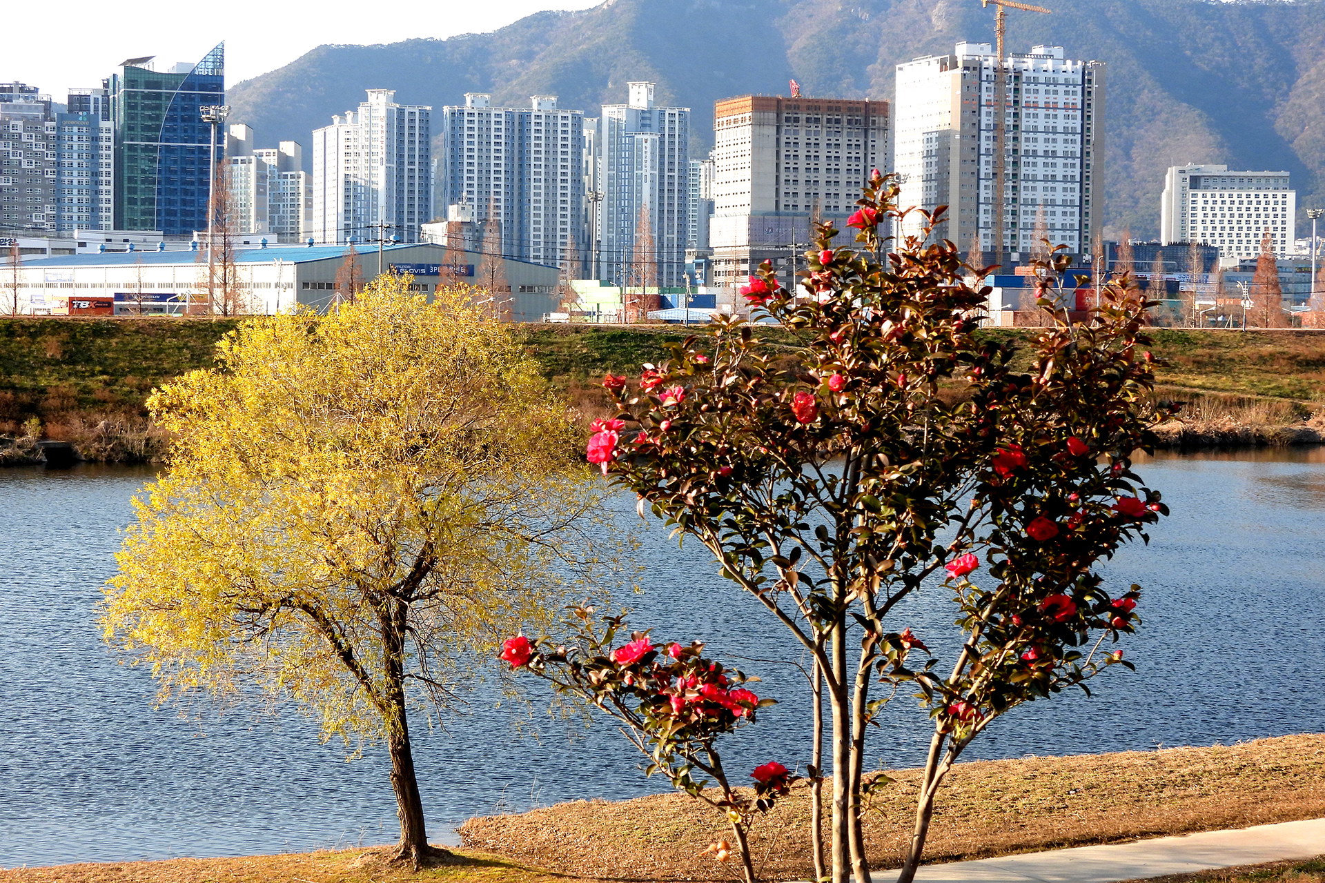 한파 몰아지는 강둑에서 봄.