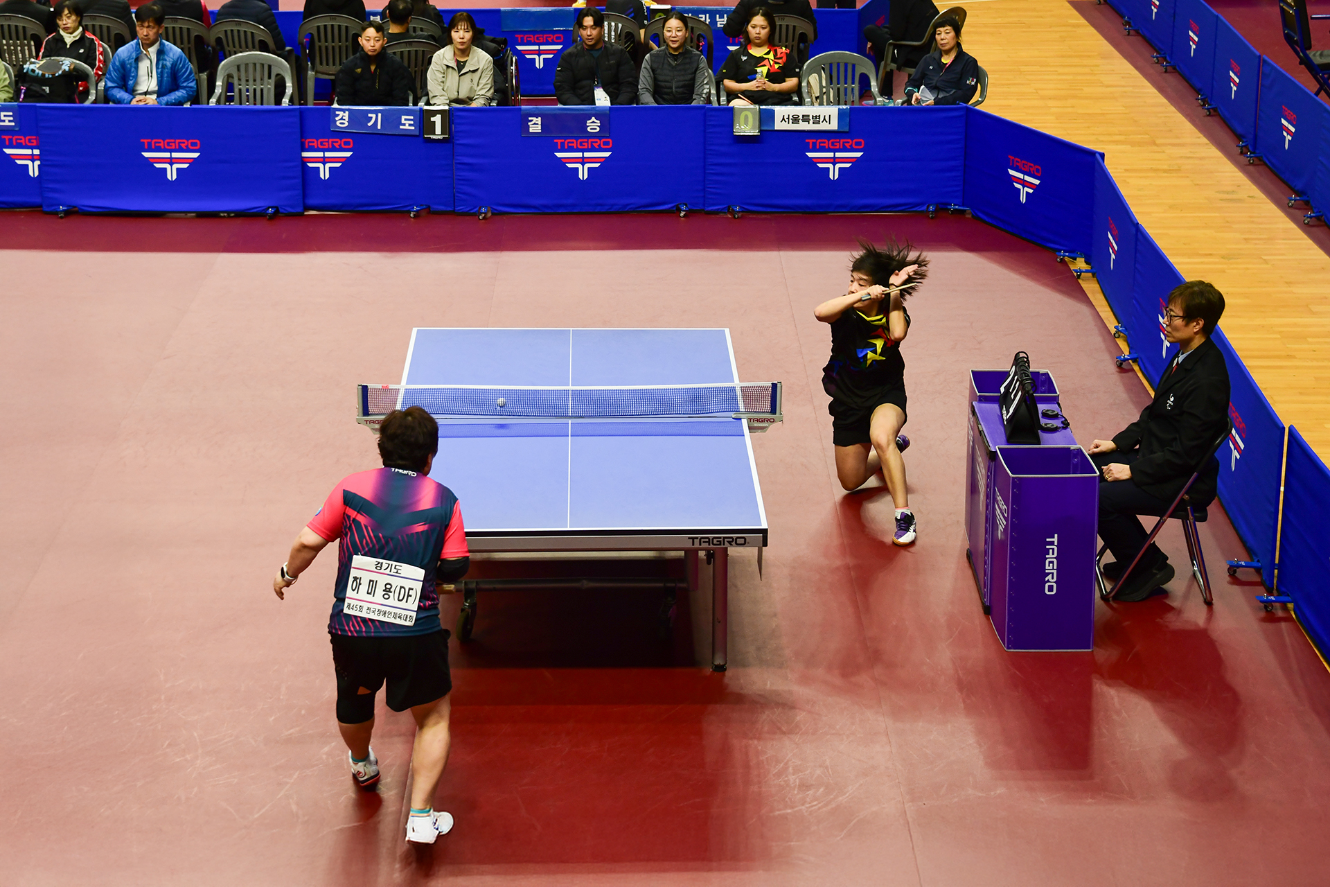 서울 선수가 탁구대 밑으로 완전히 깔아 앉은 공을 드라이브로 걸어 올렸으나