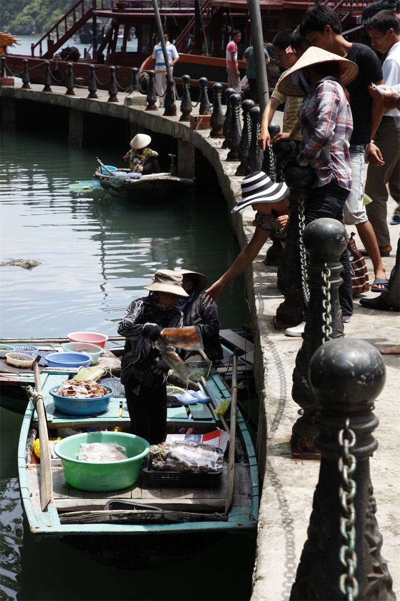 하롱시 부두에서 남서쪽 4Km 떨어진 곳에 자리잡고 하롱만에서 가장 아름다운 동굴로 손꼽히고 있는 청궁동굴. 이 동굴로 올라가는 해변에는 나무도 된 통로가 있습니다. 이 통로 주변에는 관광객들에게 물건을 팔기위해 조그만 배 위에서 장사를 하는 사람들을 볼 수 있습니다.