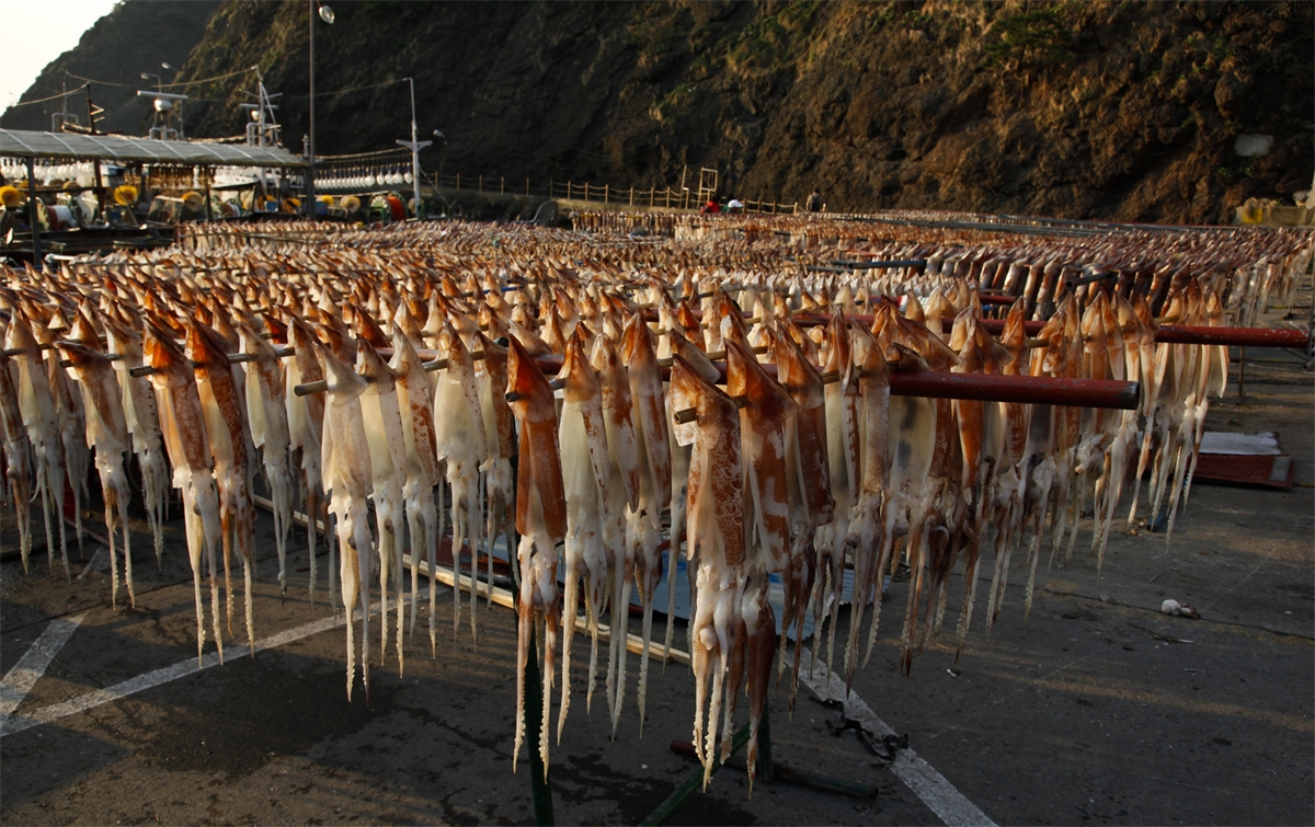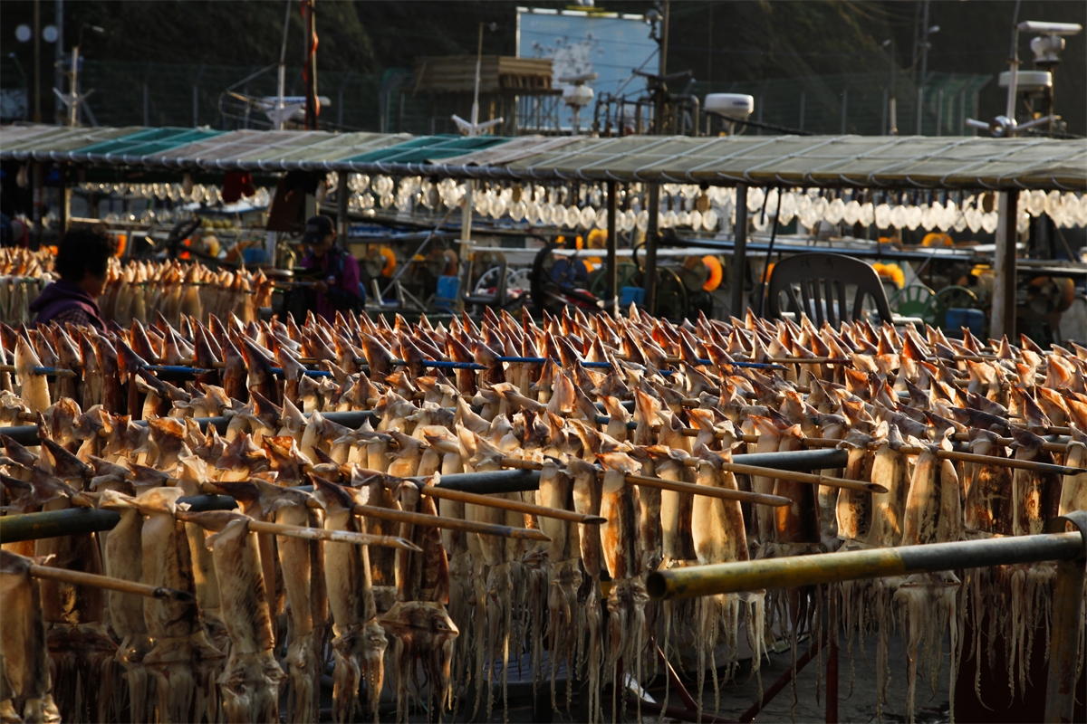 경상북도 울릉도 도동항에서 오징어를 말리고 있는 모습