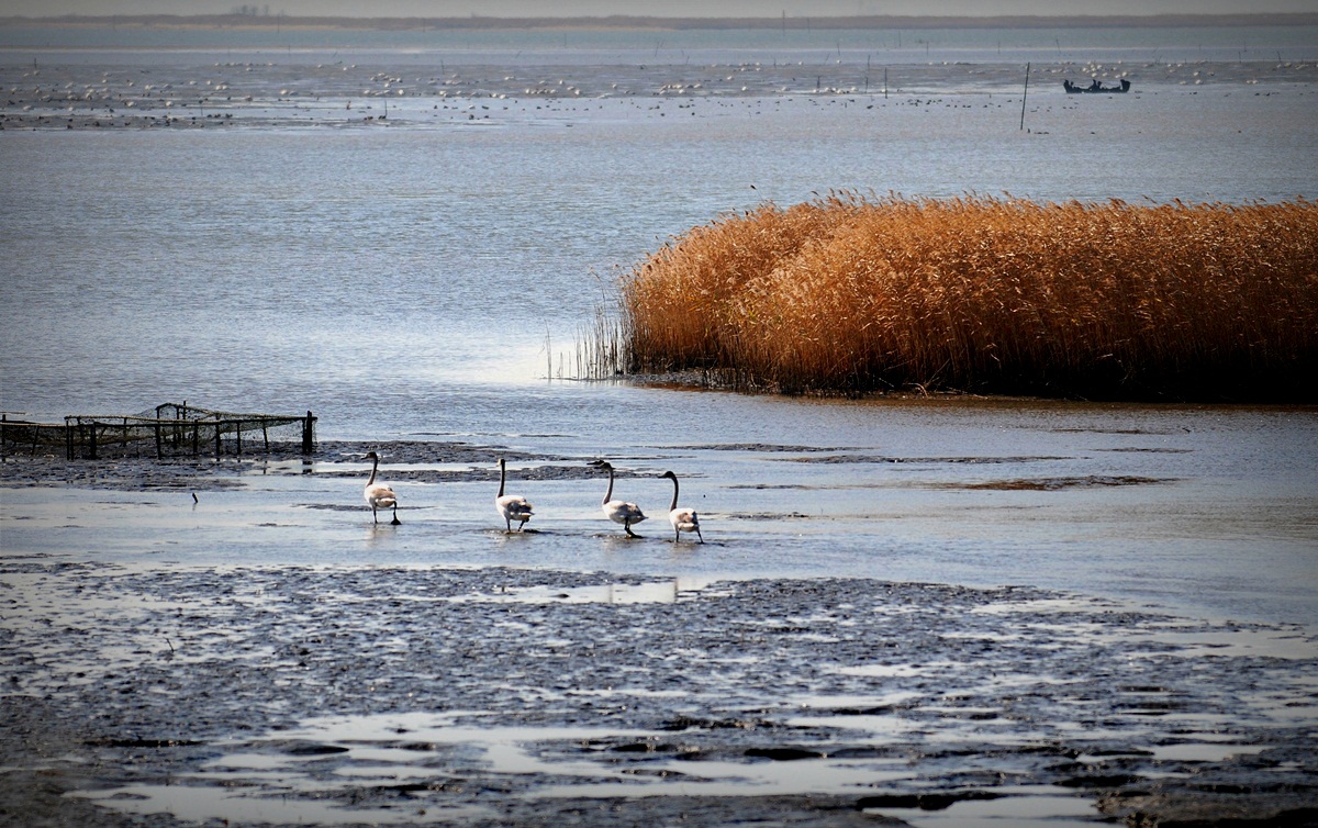 낙동강 을숙도 탐조대 4 마리의고니 가족이 걷는모습이 정겹습니다