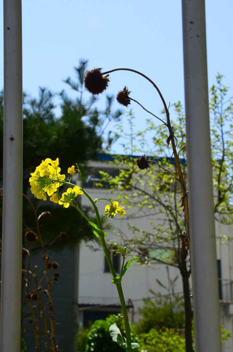 마른 해바라기 줄기앞에 예쁜 유채꽃이 피었습니다.