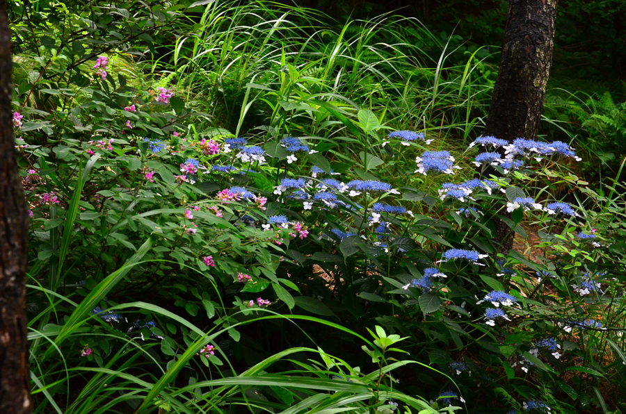 핑크빛 싸리꽃에 둘러싸인 산수국,,