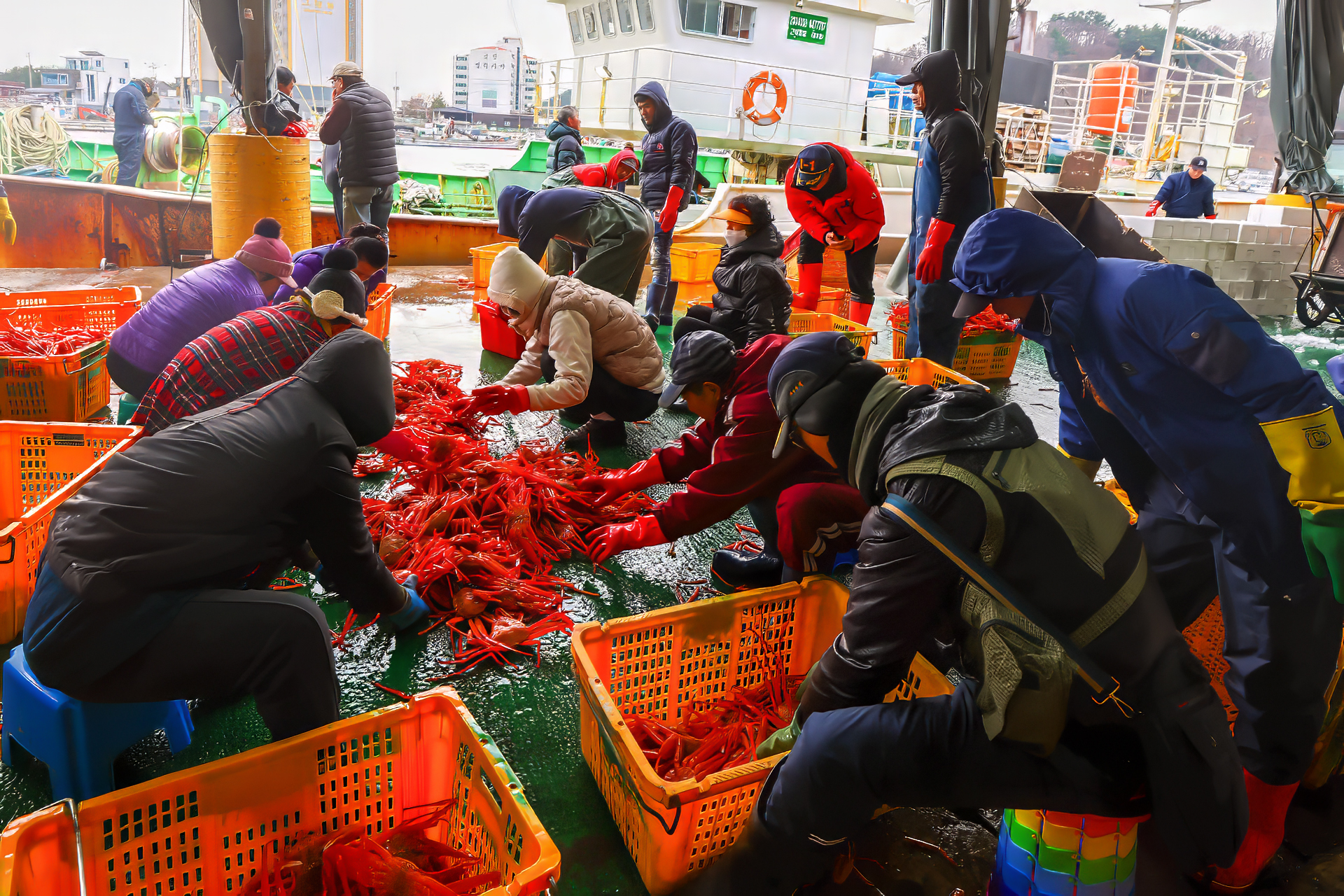 대게 먹으러 강구항에 갔는데 마침 꽃게 배가 들어와 선별 작업을 하고 계셨습니다. 독도 근항에서 잡았다고 하는데 끝없이 내리는 5천마리 정도의 된다는 🦀 처음 보는 광경이었습니다.