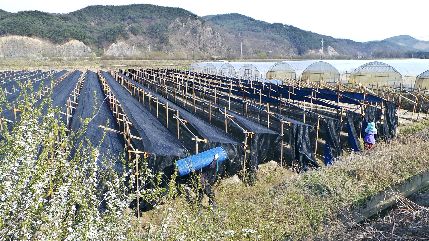 그래서 방향을 동북쪽으로 향하게하고 빗물이 직접 떨어지지 않게 포장을 친 위에 차광막더 치지유.