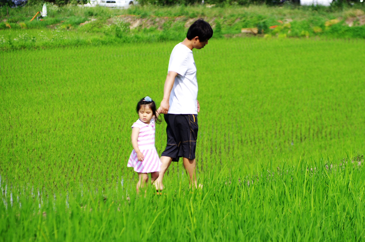 아빠와 논둑길을산책하던아이가 무었을발견하였는지 시선고정하고 있내요.
