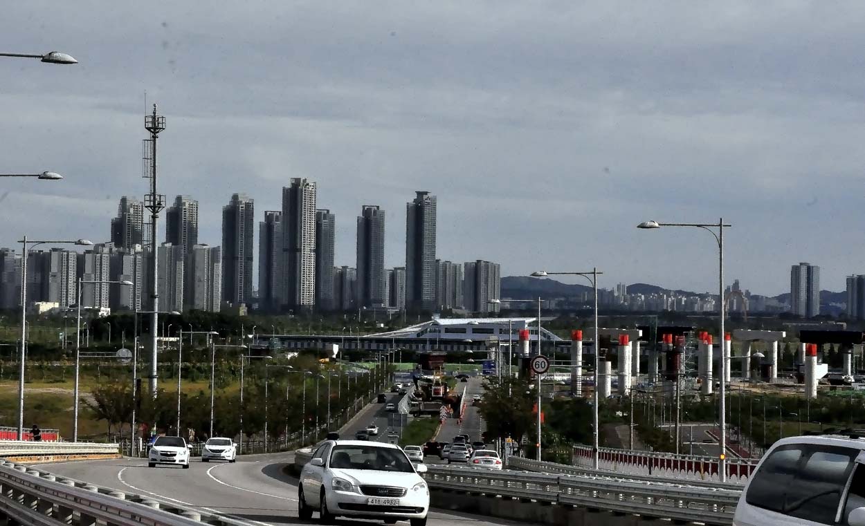현재 45억인구의 아세안올림픽이 시작된 서인천 청라지구 타운 <뒤 올림픽선수촌과 메인스타디움 그리고 상판적색 세멘교각기둥은 강화도까지가는 고속도로 작업현장> *