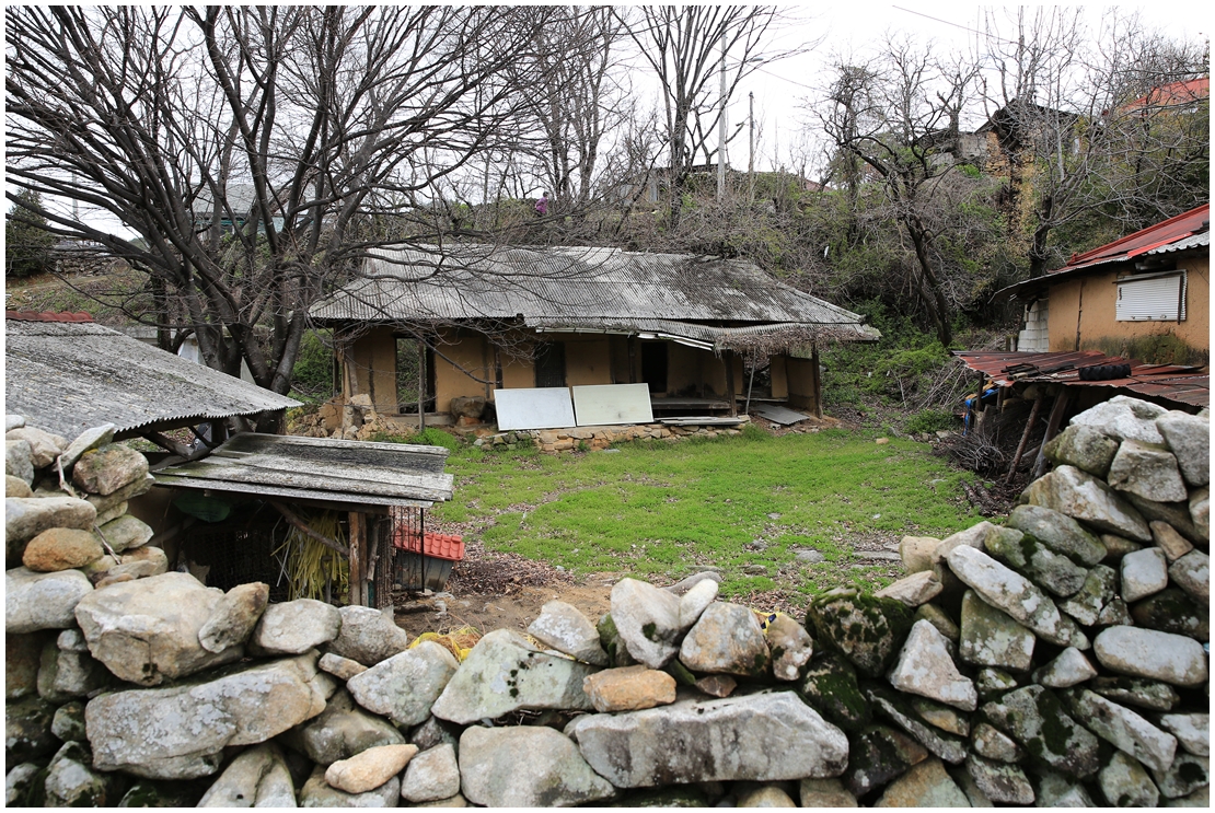 시골 마을 한가운데 지붕이 기울어지는 폐가의 모습이 안타까워 보입니다.