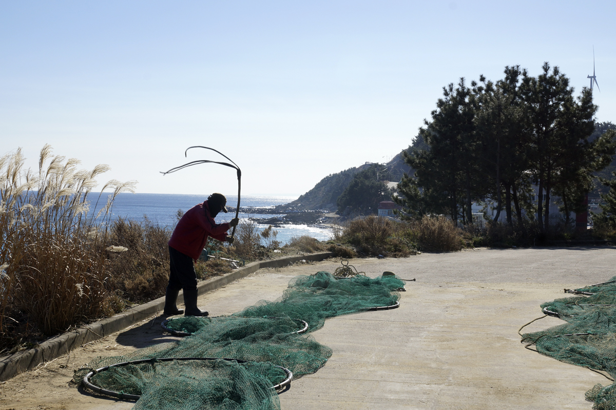 그믈에 걸린 해초를 말려서 도리께로 털고있는거지유.