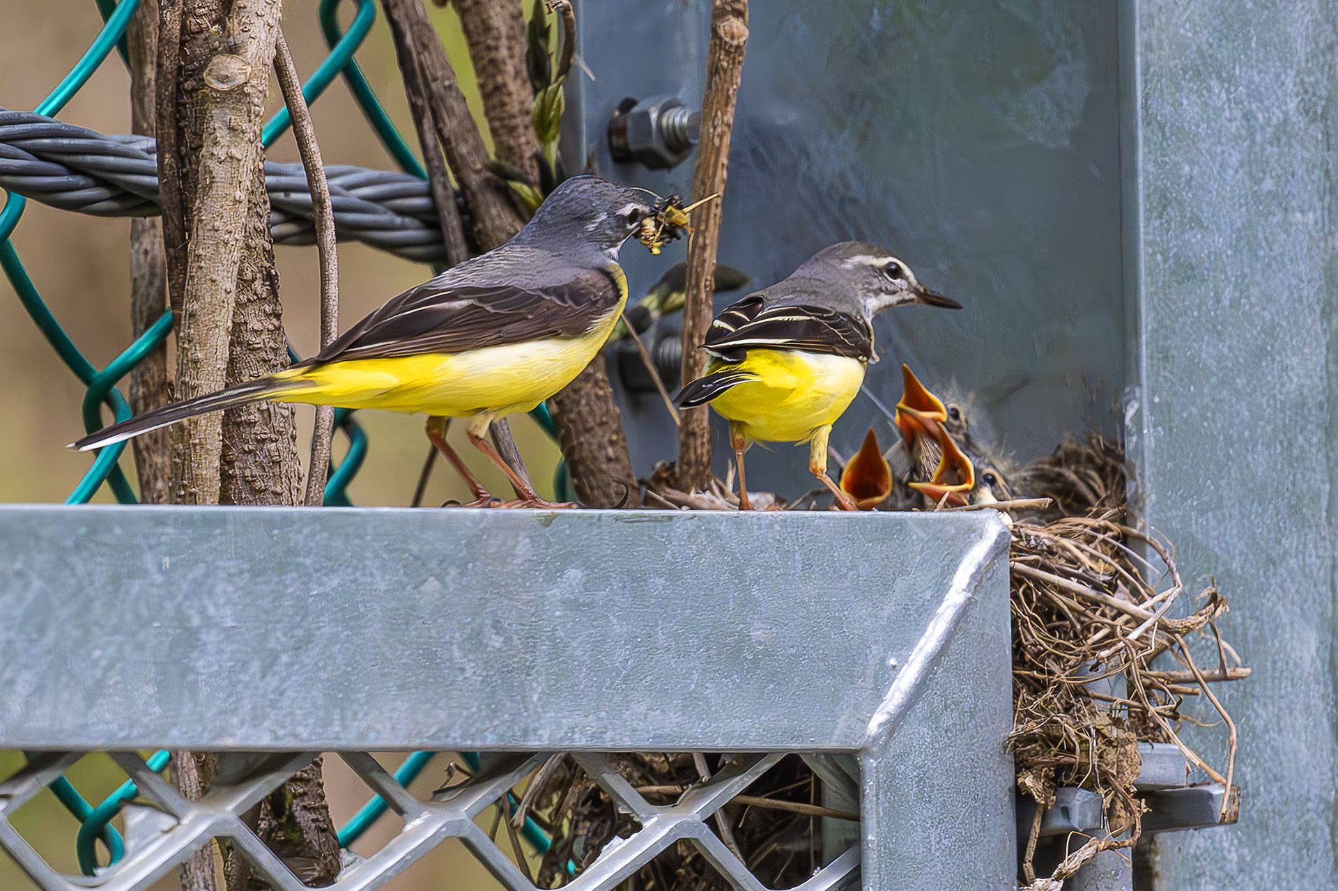 도롯가 산사태방지를 위해 쳐놓은 철망 앵글사이에 최고의 보금자리.
