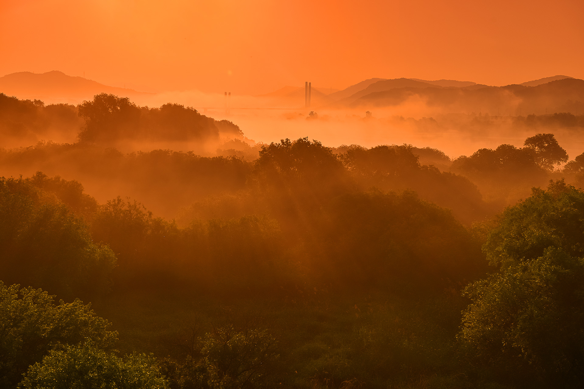 일출빛 신록의 빛내림 풍경.(창고작)