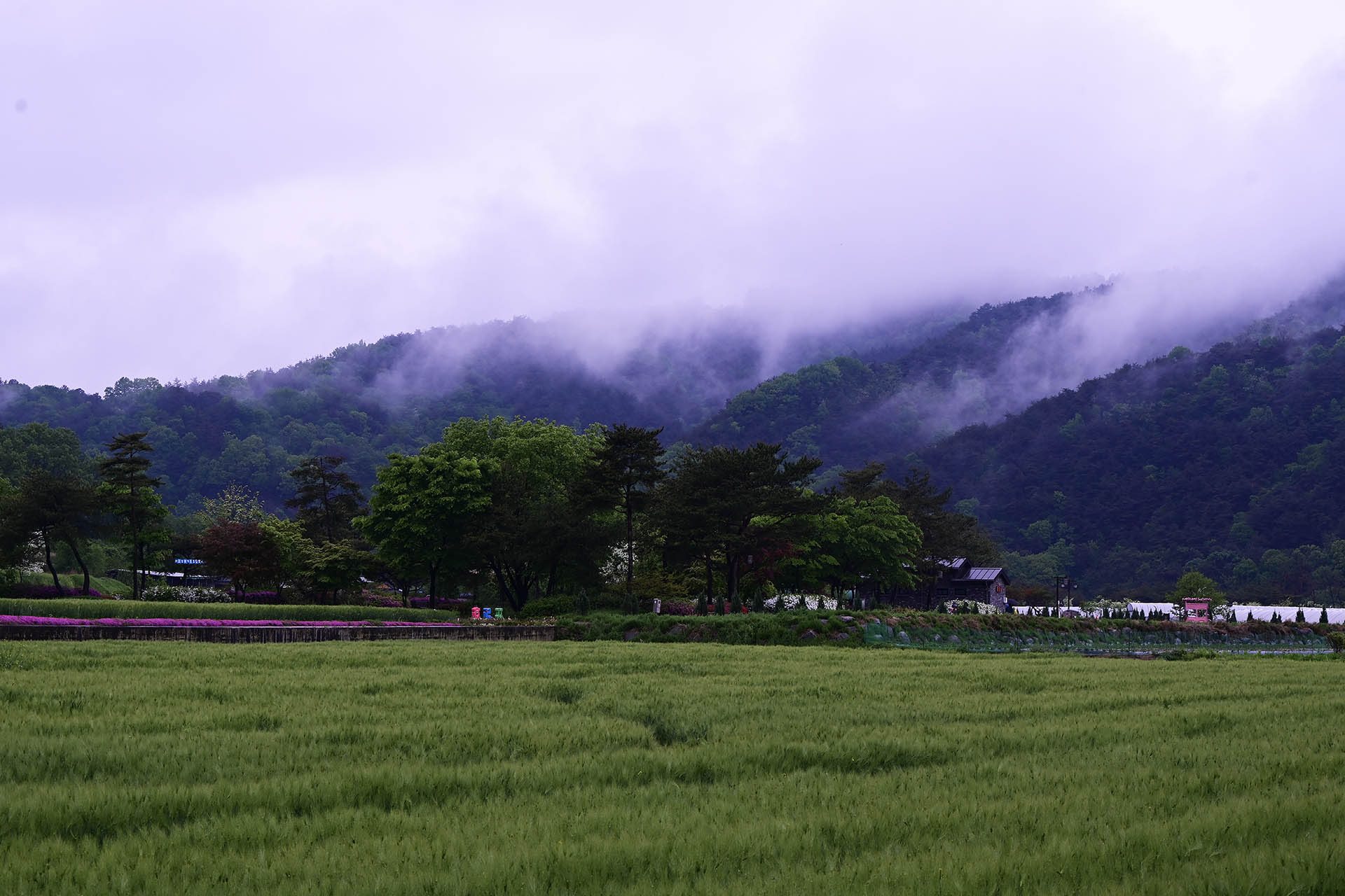 보리밭 너머 회룡포의 마을이 보입니다.