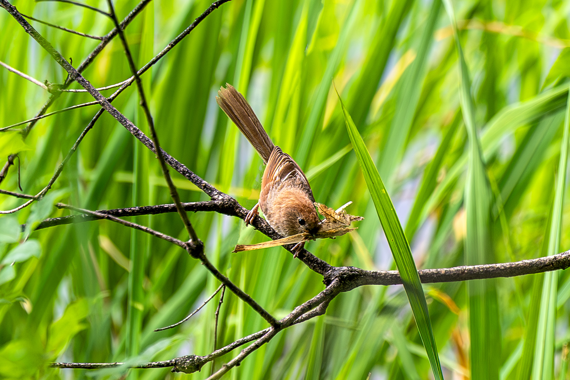 산란을 위한 둥지 재료를 물어오는 오목눈이