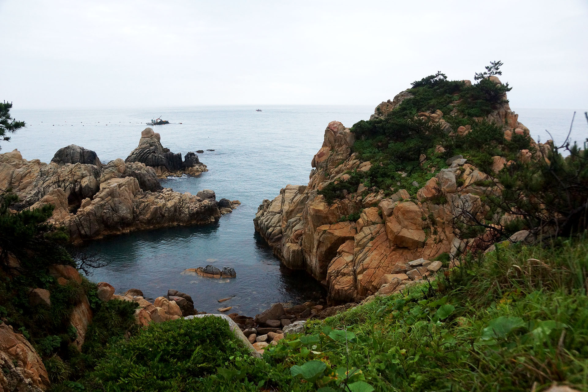 파래 작업을 하는 배가 보이는 풍경입니다.