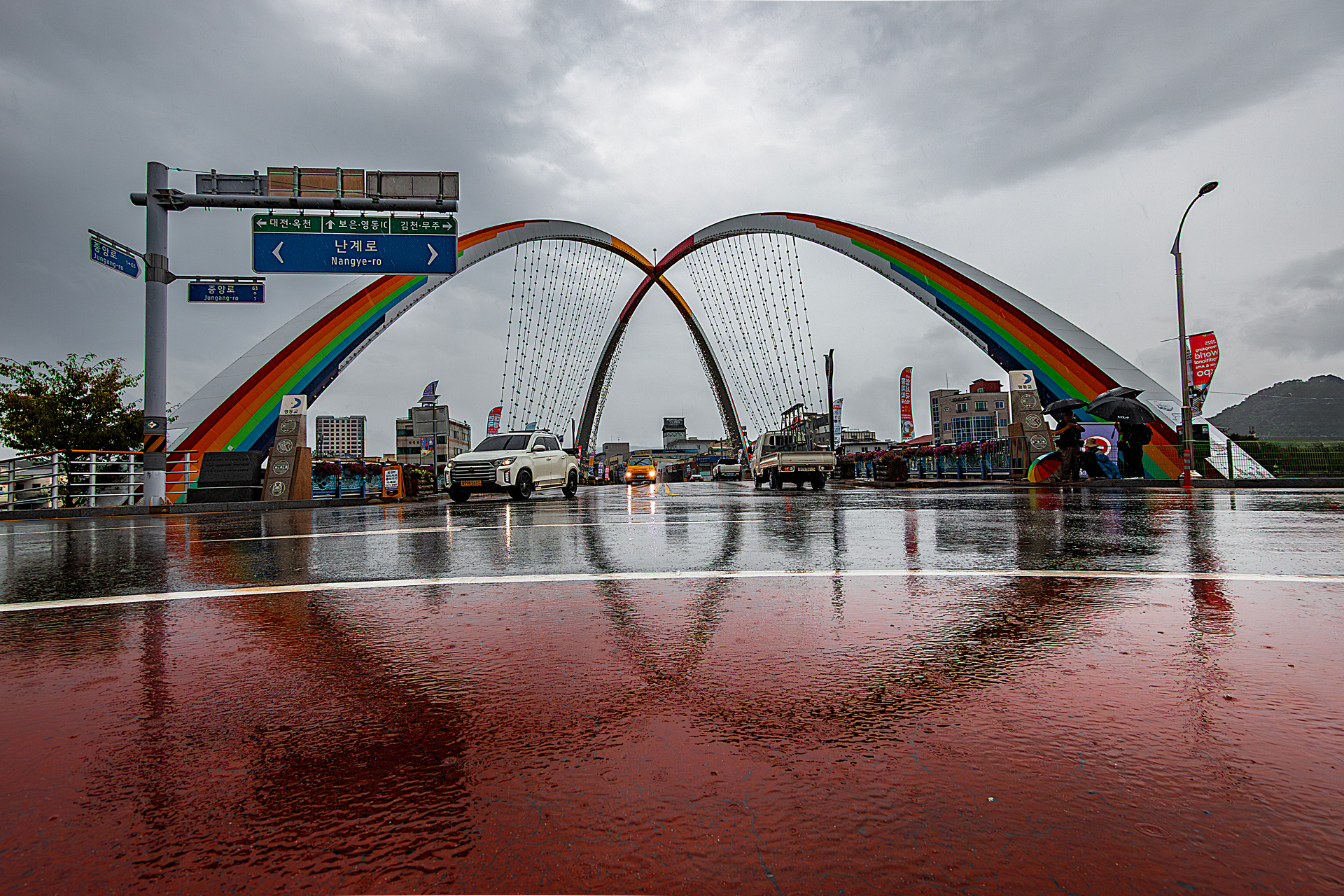 거리퍼레이드가 우천으로 취소되어 오다가 다리에서 반영사진을 찍음