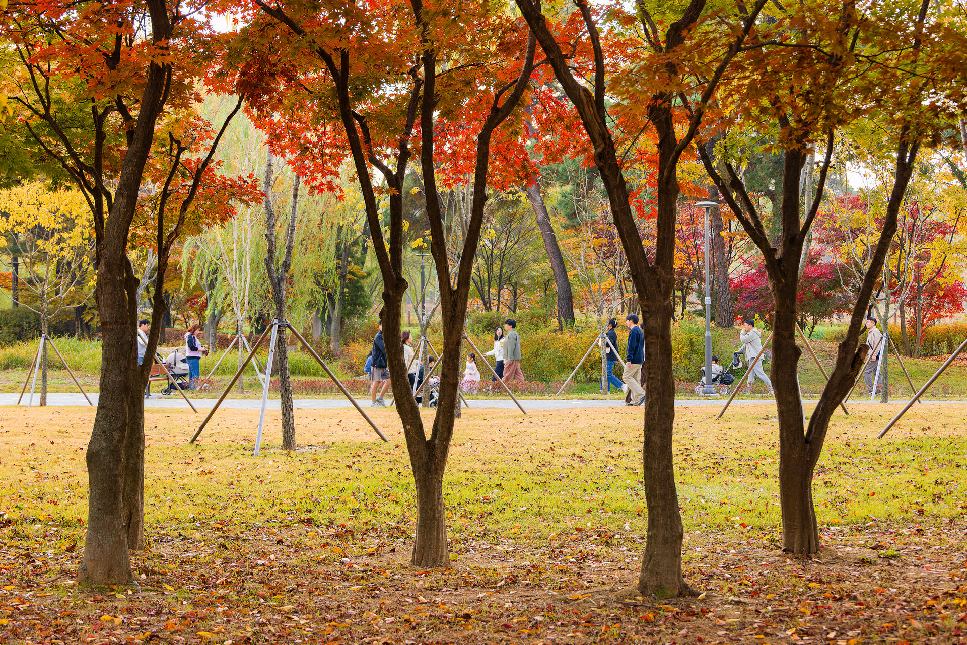 공원 가을의 경치를 즐기러 나온 사람들