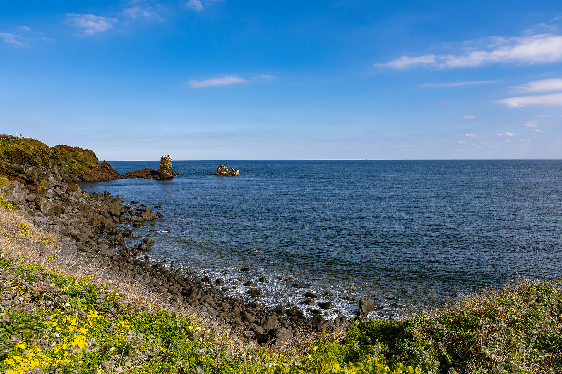 시원스런 바다와 거기 서 있는 바위 하나