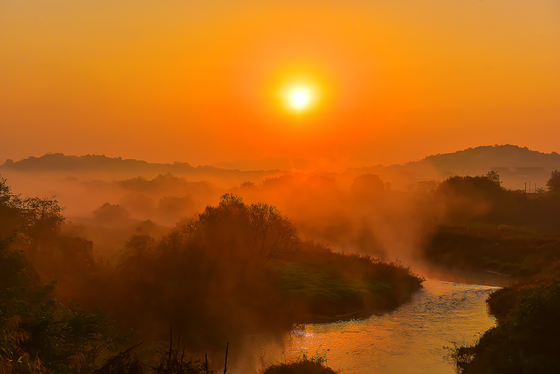 일출 물안개가 피어오르는 풍경..