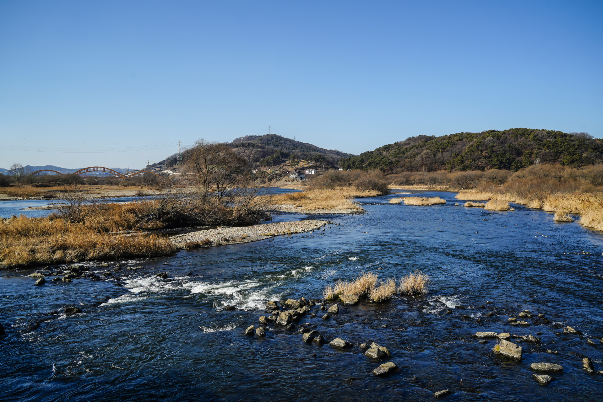 하늘에 구름 한 점 없이 맑은 날 유난히 푸르게 보이는 금강입니다.