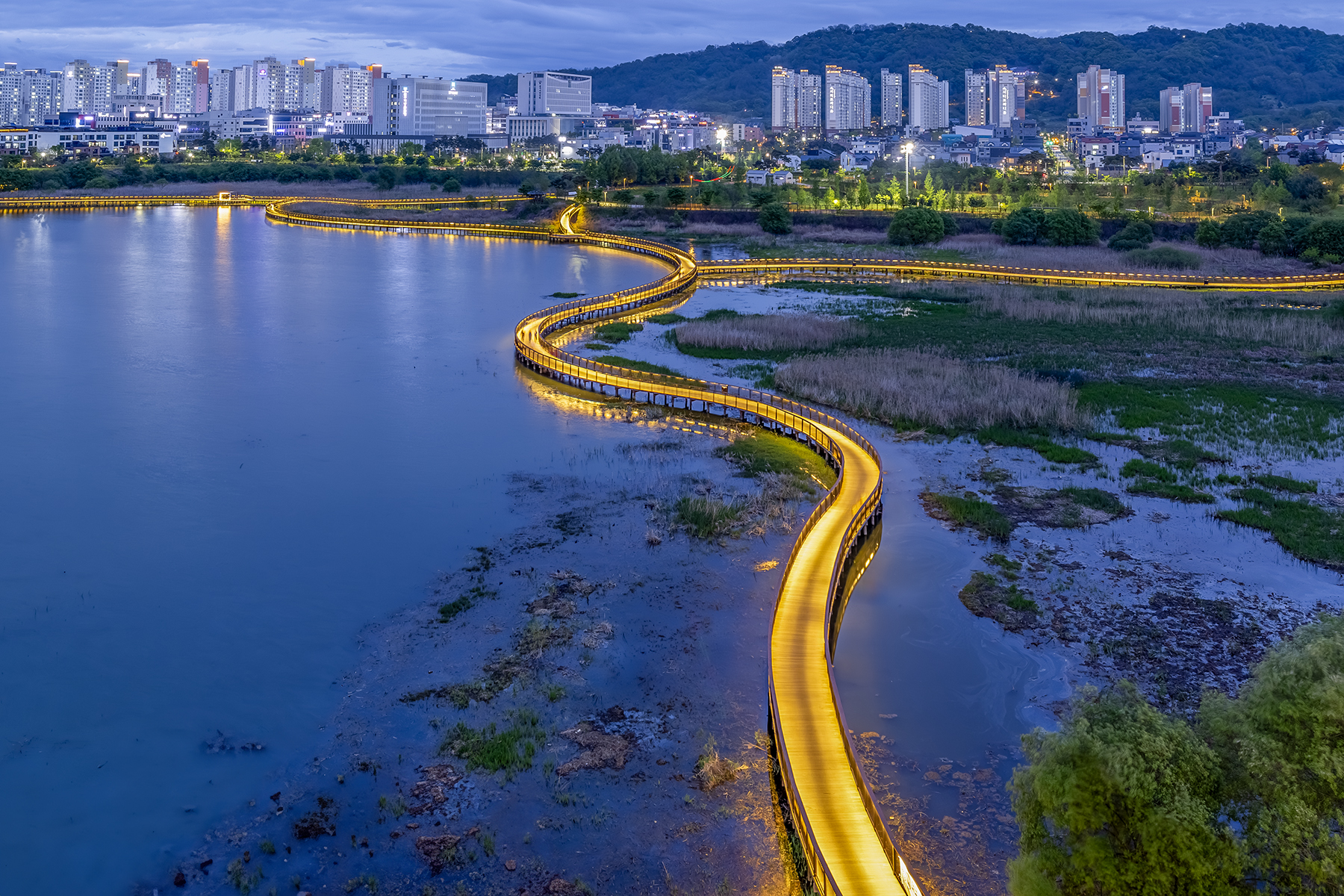 어둠이 내린 도시의 호수를