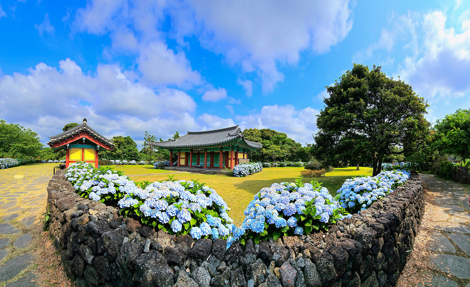 맑은 하늘과 돌담 그리고 수국