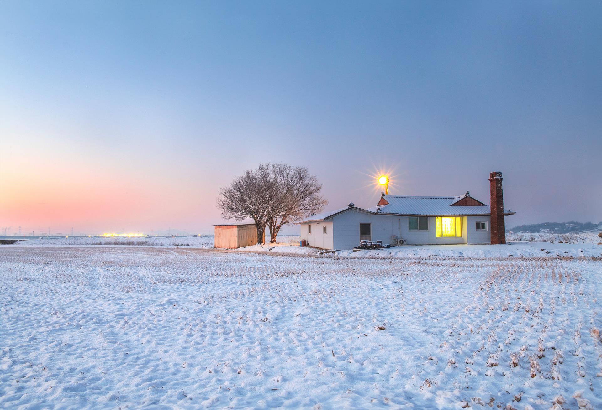 우강 눈오는날 농촌야경 풍경입니다