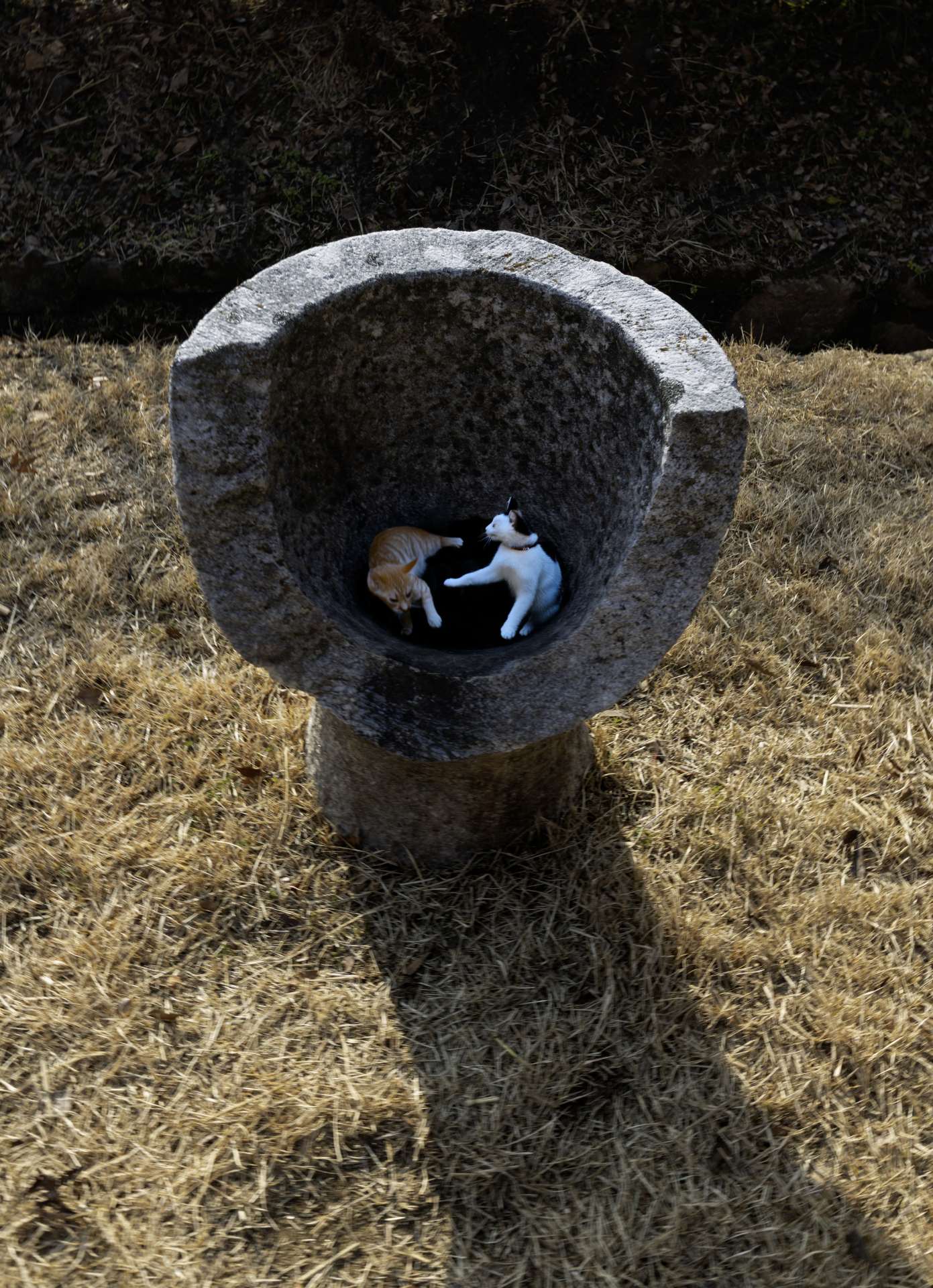 깨어진 돌 절구안에 고양이 부부가 들어가 재미있게 장난하고 있습니다.