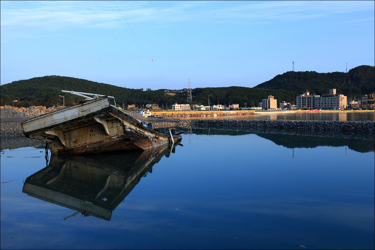 바닷가 한 구석에 생을 마감한 어선 한척이 비스듬이 누워있다...