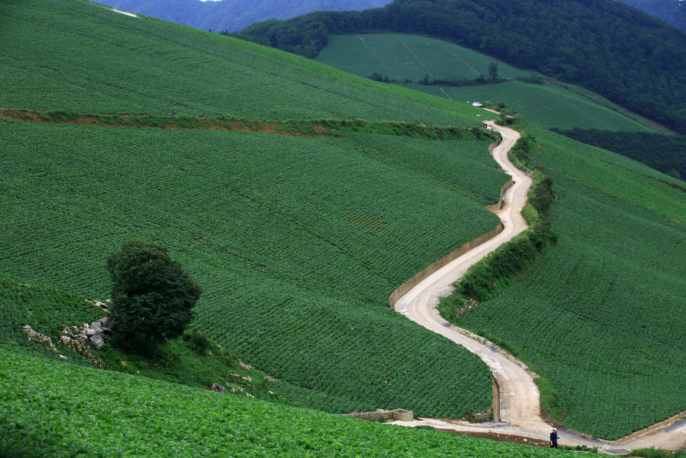 초록나무 앞에 길이 있습니다.