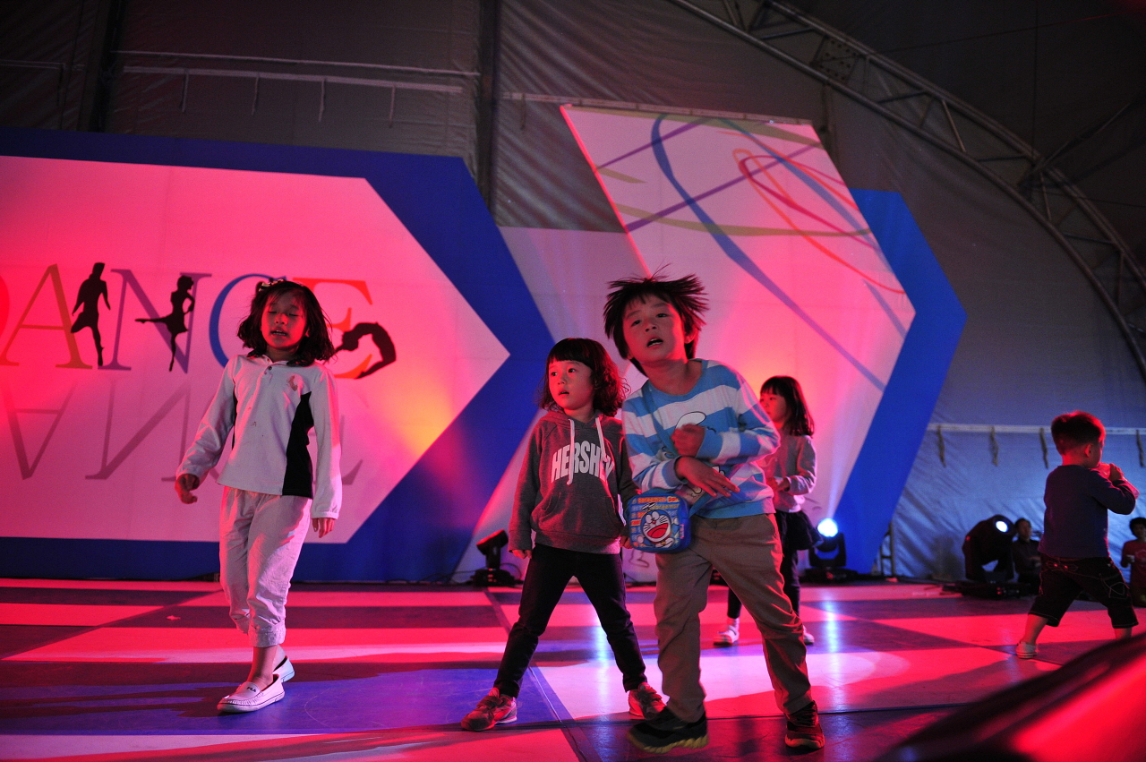 어린아이들이 강남스타일 노래에 맞춰 춤을 열정적으로 추며  무대를 온통 휘젖고 다니다.