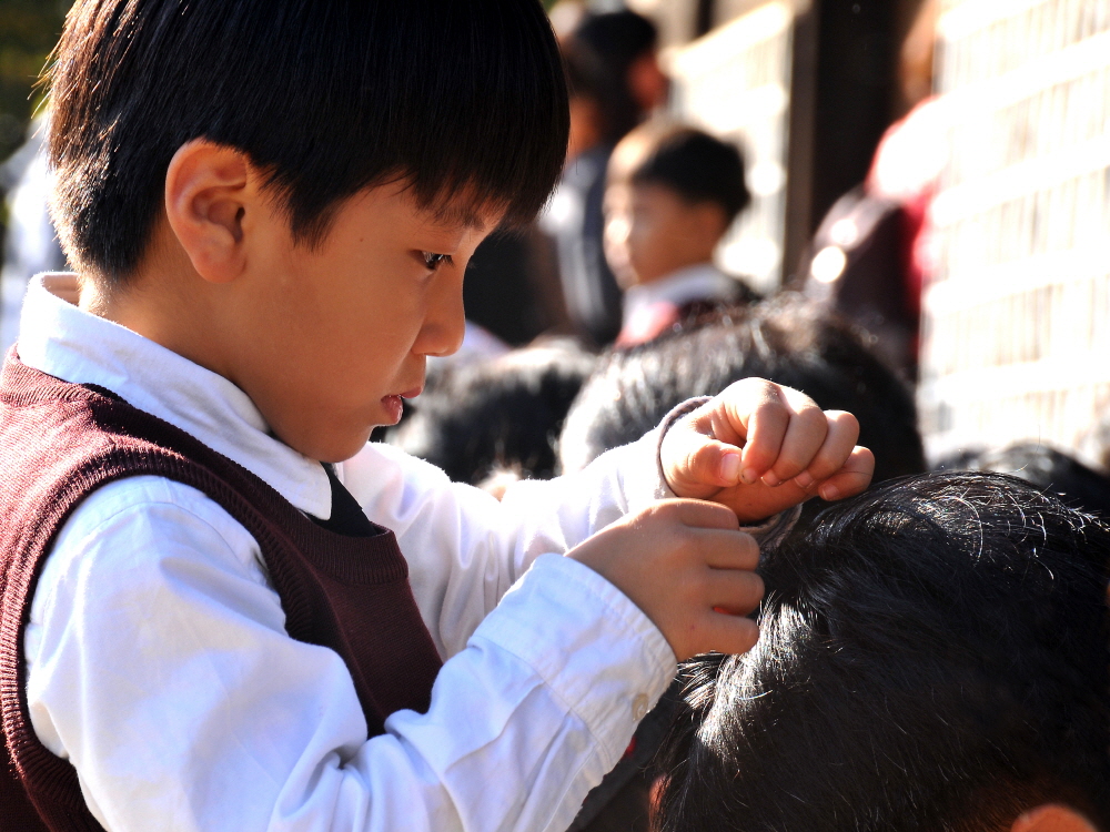 진지한 표정으로 새치를 뽑는 꼬마의 눈길이