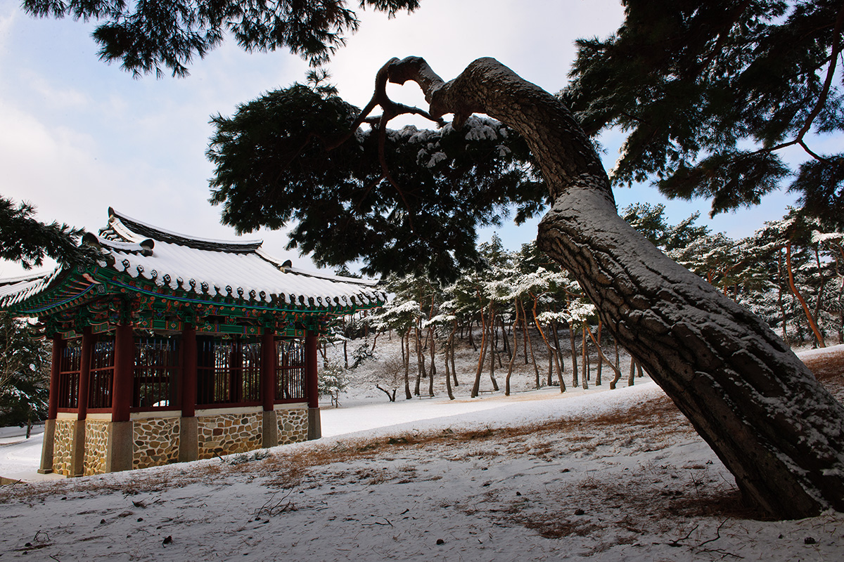 이충무공 묘소 누각을 지키는 소나무 한 그루.
