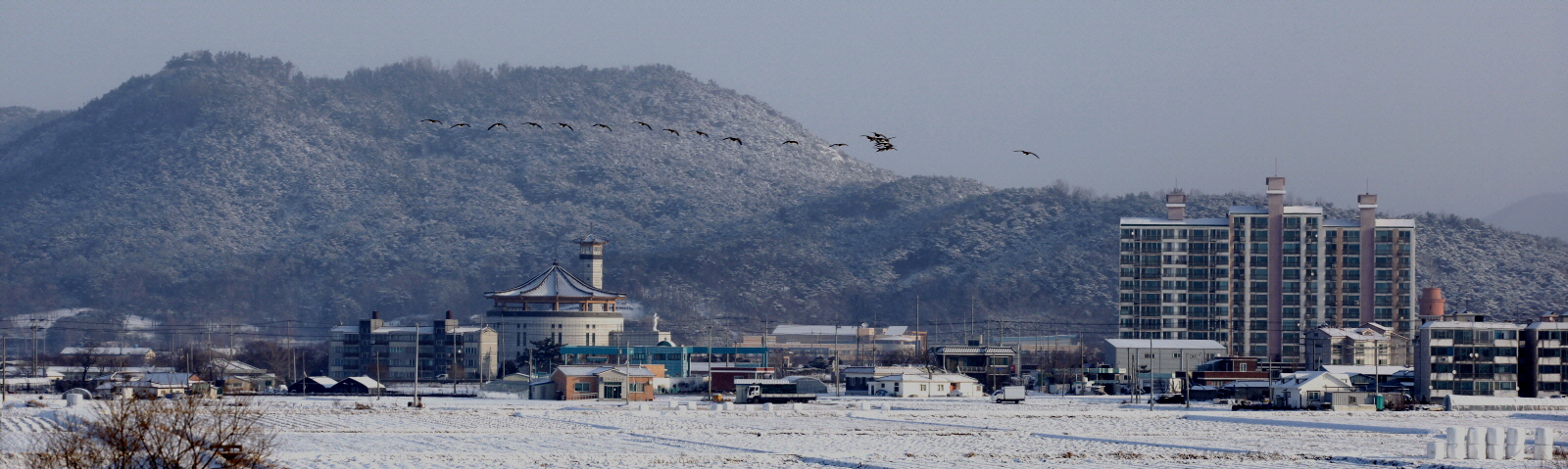 눈 쌓인 어느 시골 마을에 조용한 아침풍경,