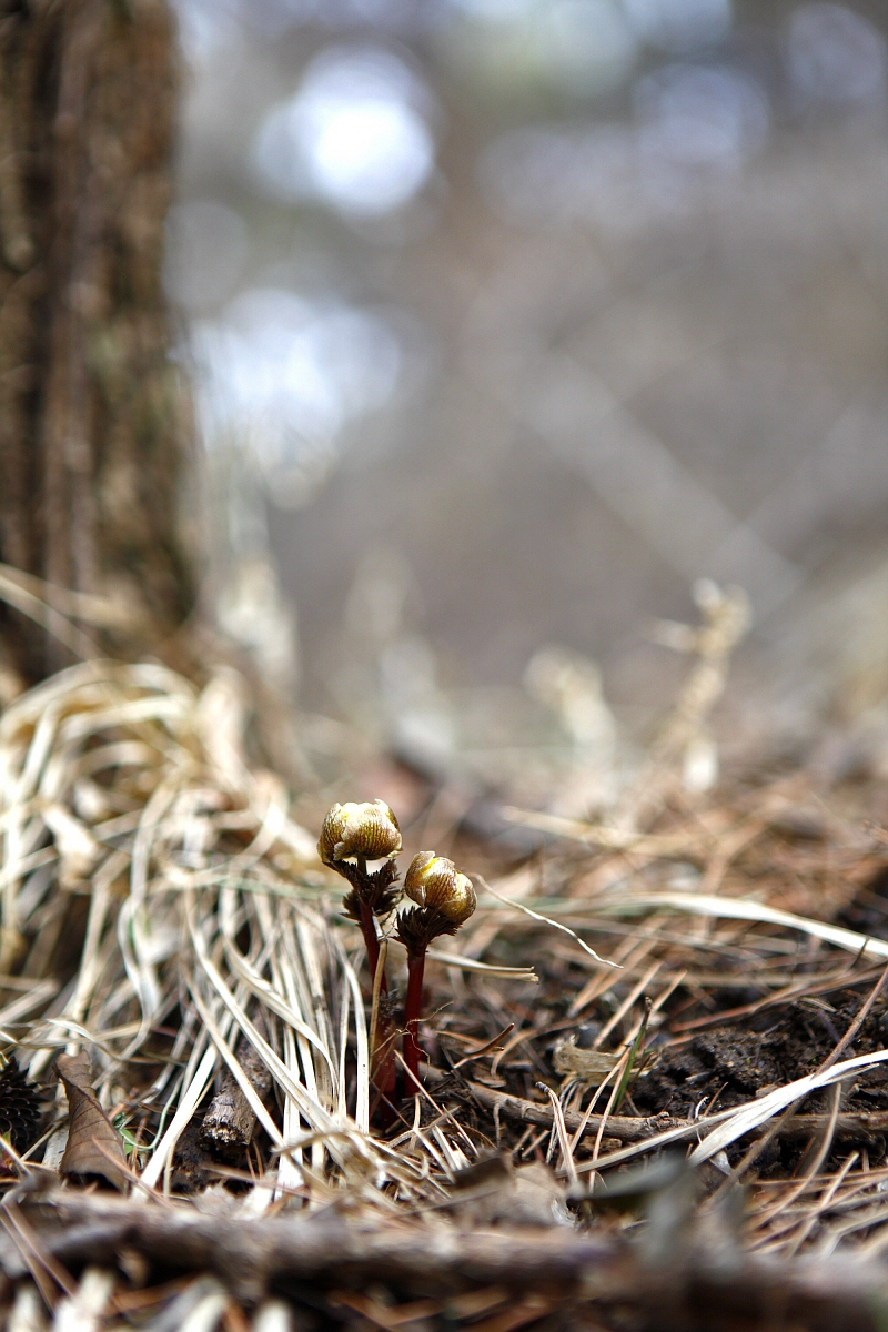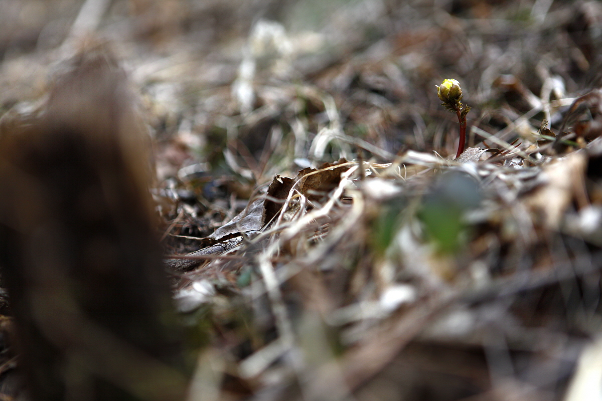 복수초는 한 걸음 뒤에서 살짝 고개를 내밀어 올리고 있었다.