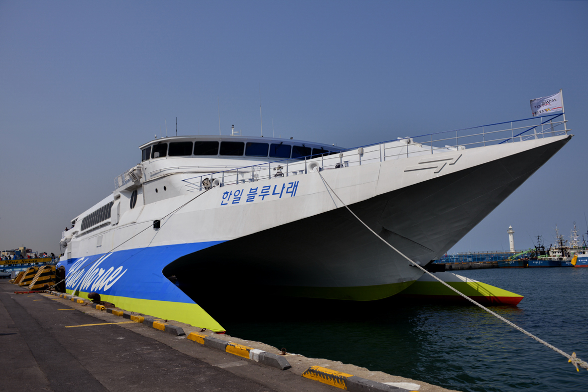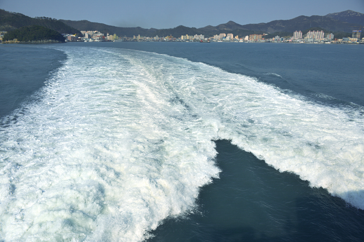 서서히 멀어저가는  완도항의 전경과 제주항에 기항한 한일 불루나래호의 위용