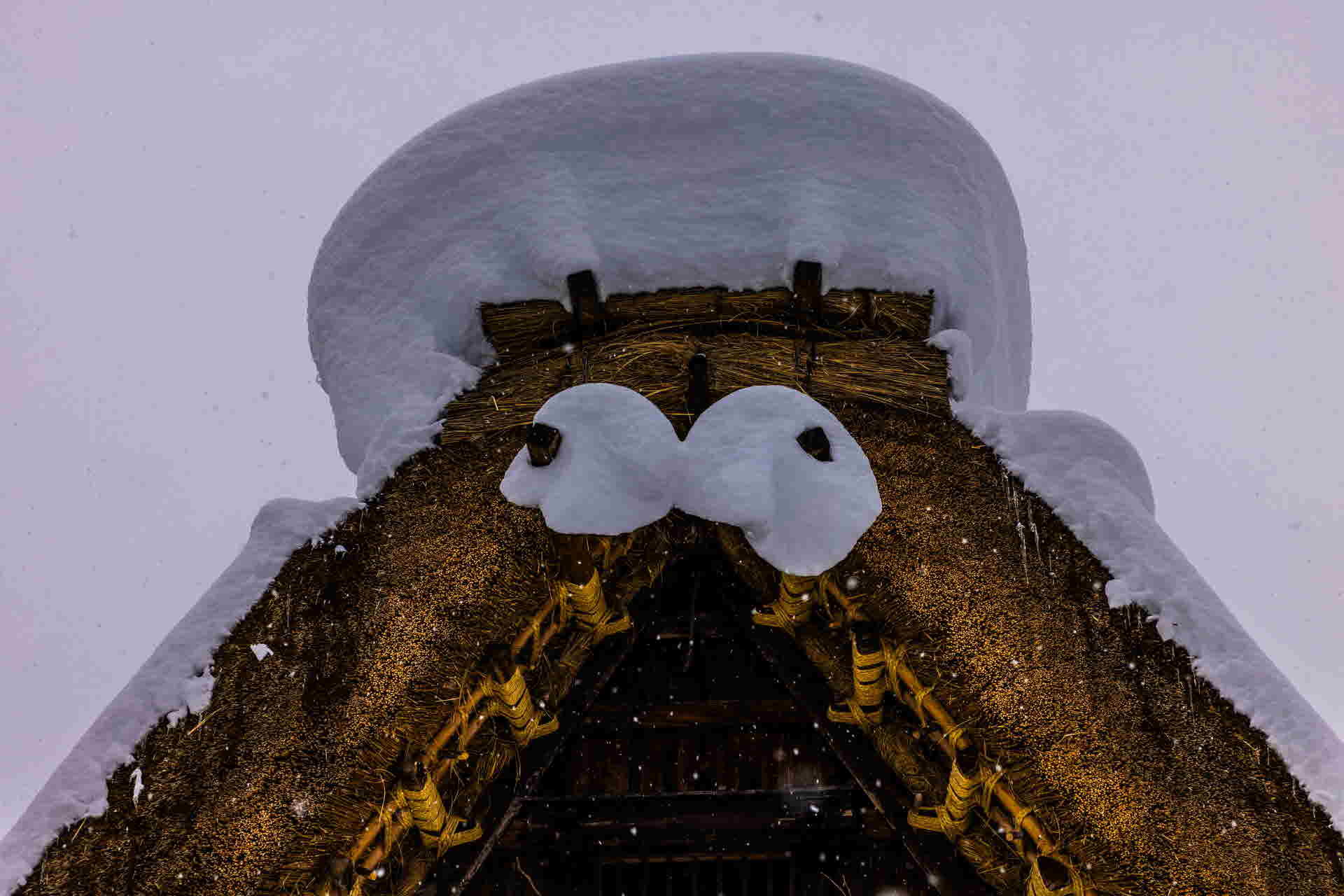 지붕 위에 내린 눈이 흰머리의 감시자가 두 눈을 뜨고 지켜보고 있는 듯한 모습을 하고 있네요.