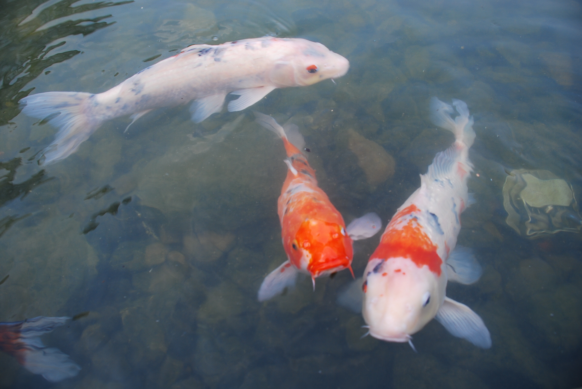잉어 세 마리가 물 속을 유유히 헤엄치는 모습