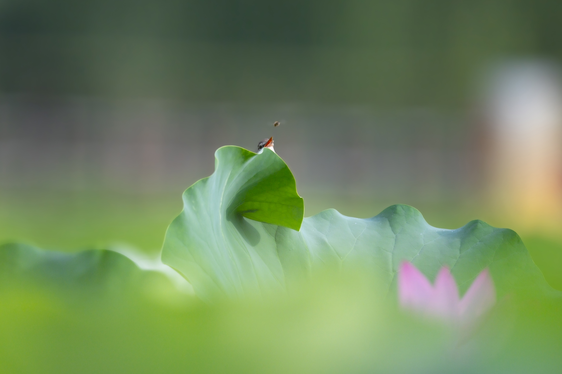 개개비가 즐거이 노래하는 와중에 벌 한마리가 개개비에게 다가오네요.