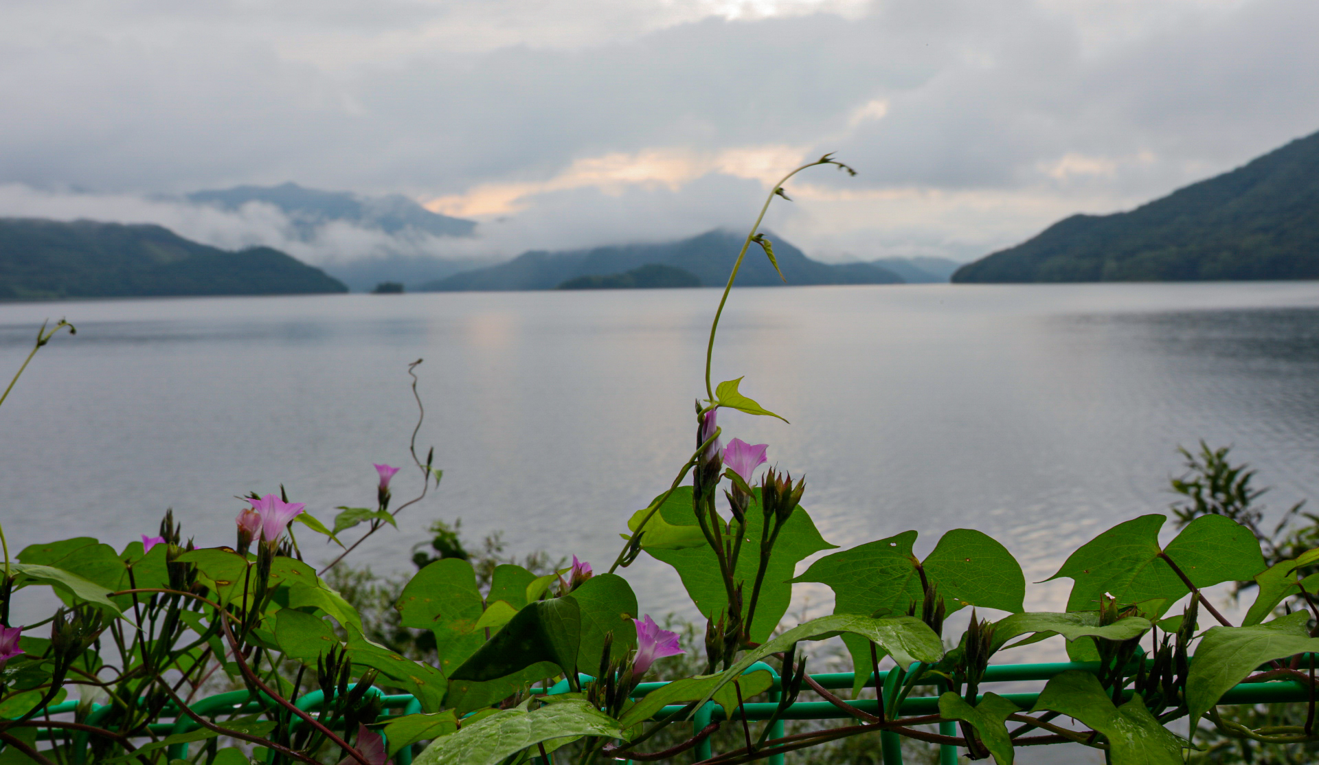 용담댐을 드라이브하다 호숫가 울타리를 타고 오르는 작은 덩굴에 핀 연분홀 메꽃이 너무 귀여워서 찰칵