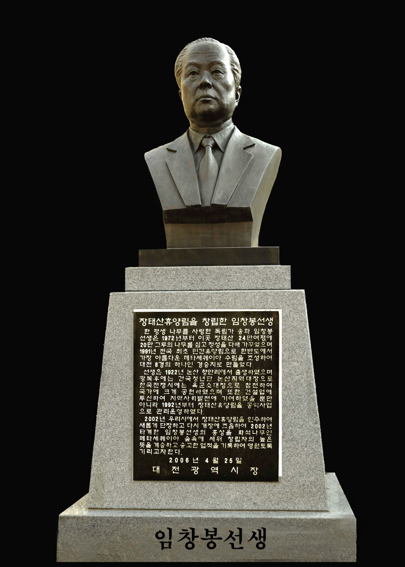 장태산 휴양림 창림자 임창봉 선생 1. 선생님의 고귀하고 거룩한 뜻으로, 대전 시민 아니 전 국민의 관광지가 되었다. 2. 장태산을 찾을 때 마다 고개 숙여 감사하면서, 메타스콰이어 산소를 호흡합시다. 3. 우리도 개척 정신을 배웁시다.