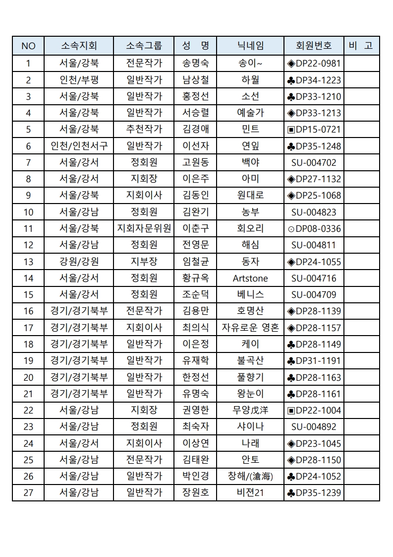 [연수실] 장노출 6개월반 8차 출사 참석자 명단