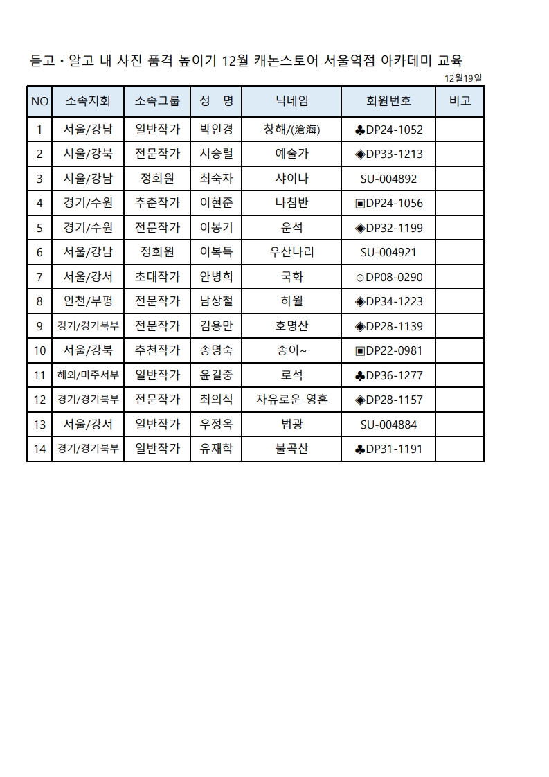 [연수실] 듣고 알고 내 사진 품격 높이기 12월 2차 교육 (추가)참석자 명단