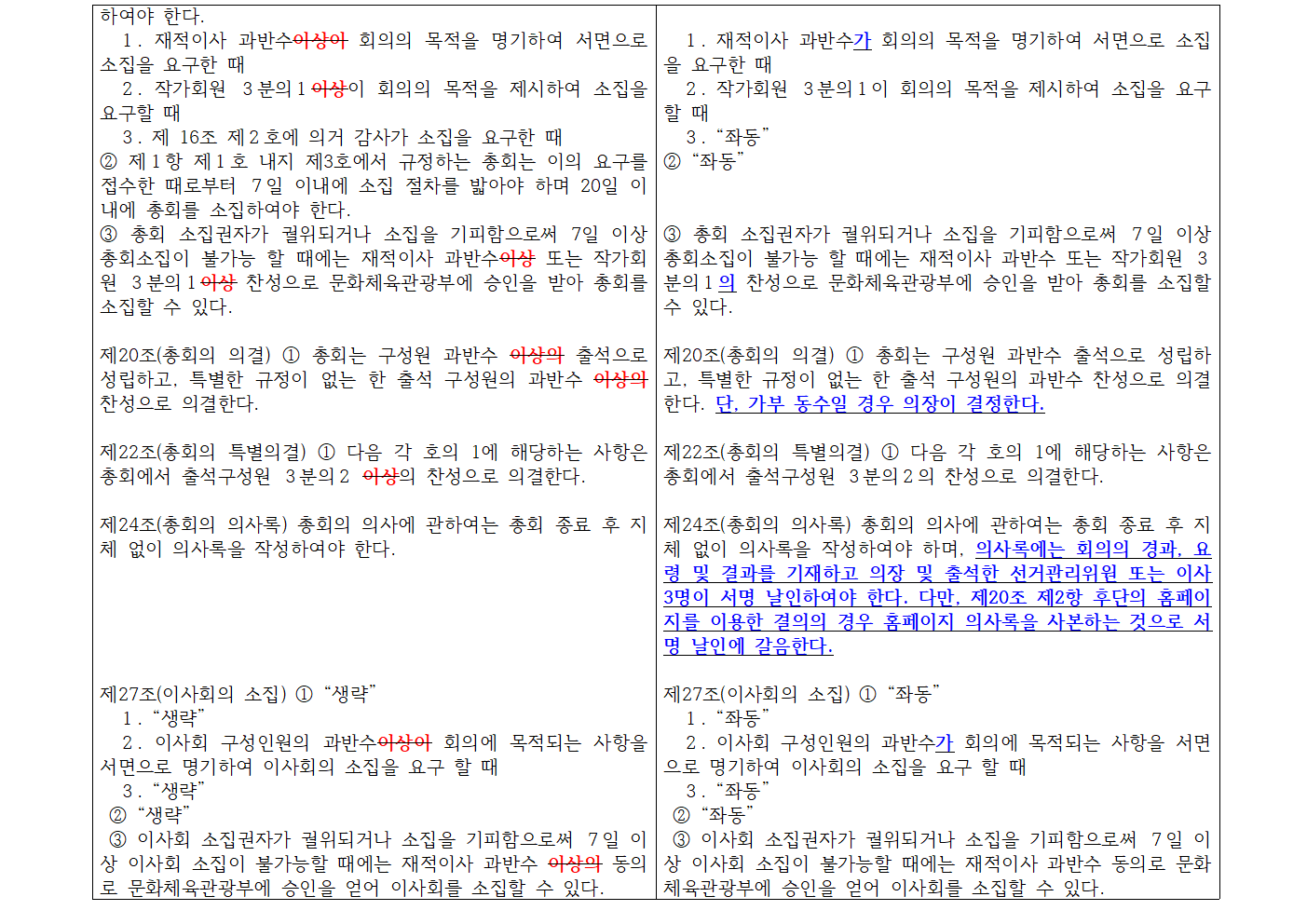 ⦁주문 : 대의원 59명중 39명 출석하고, 출석이사 전원 찬성으로 안건 제1호 정관개정(안)은 원안대로 문화체육관광부에 개정을 요청하기로 의결함
