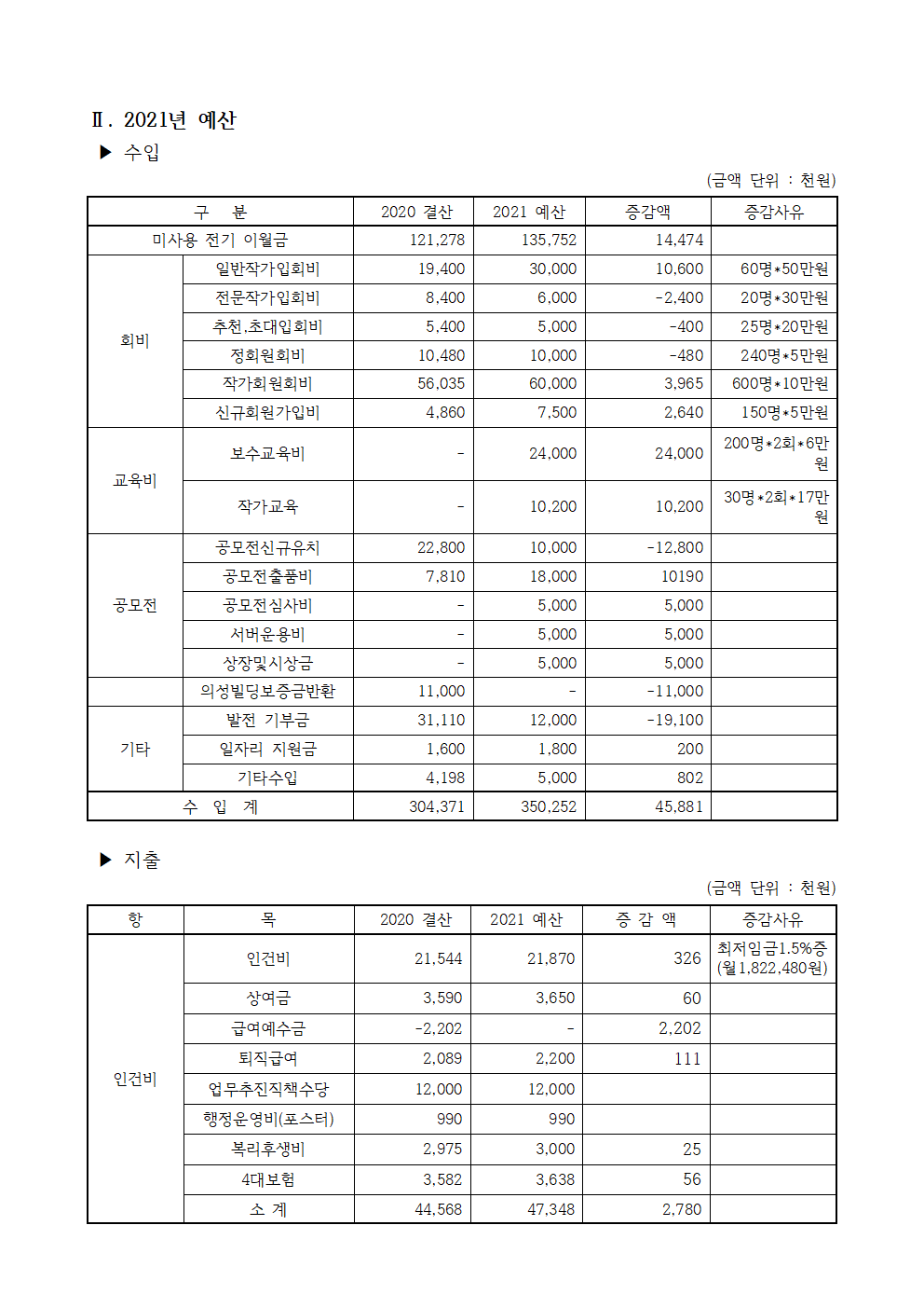 <붙임> 2021년 사업계획 및 예산(안)