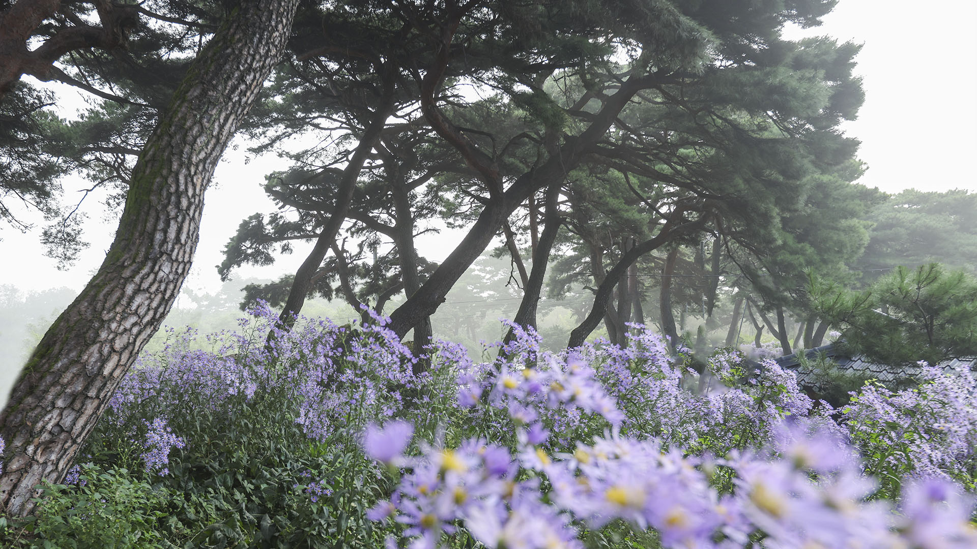 안개 자욱한 개미취밭