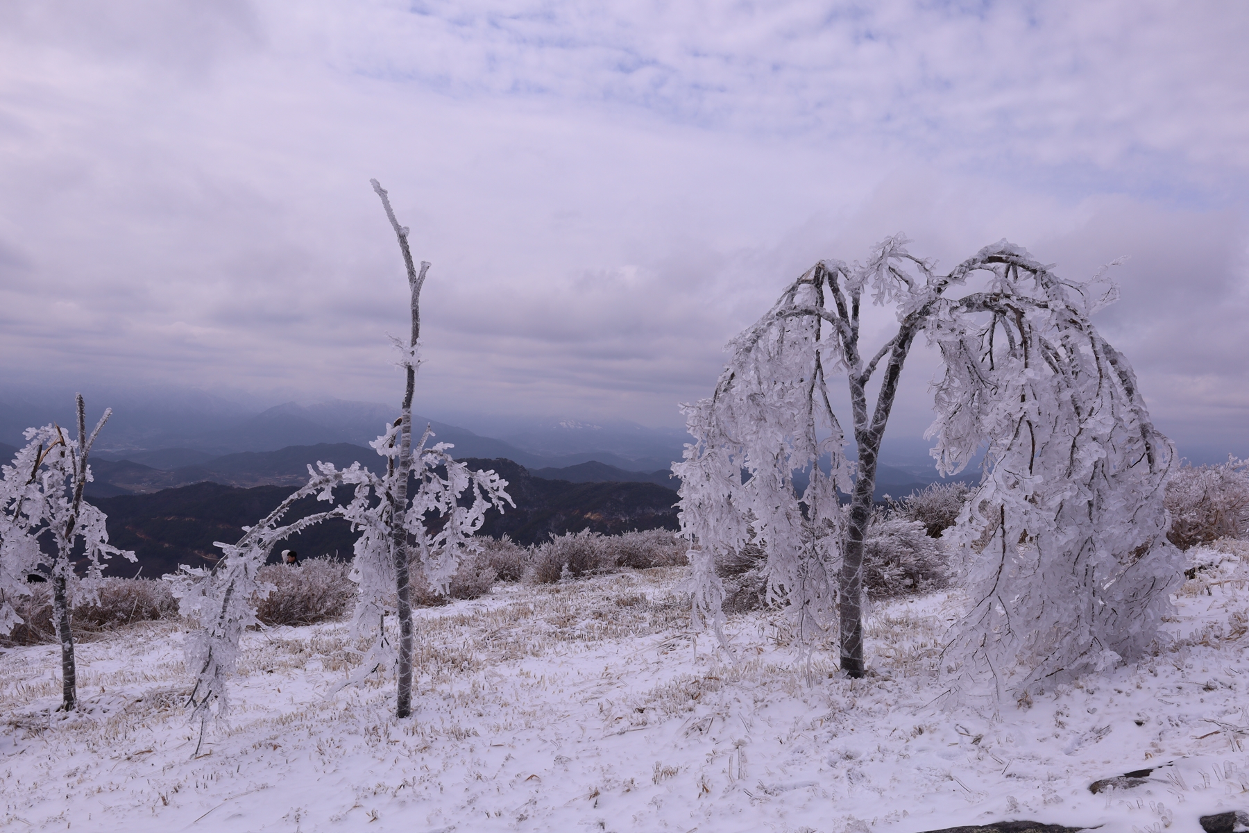 나무가지에 맺힌 얼음의 무게를 견디지 못해서 처지는 모습