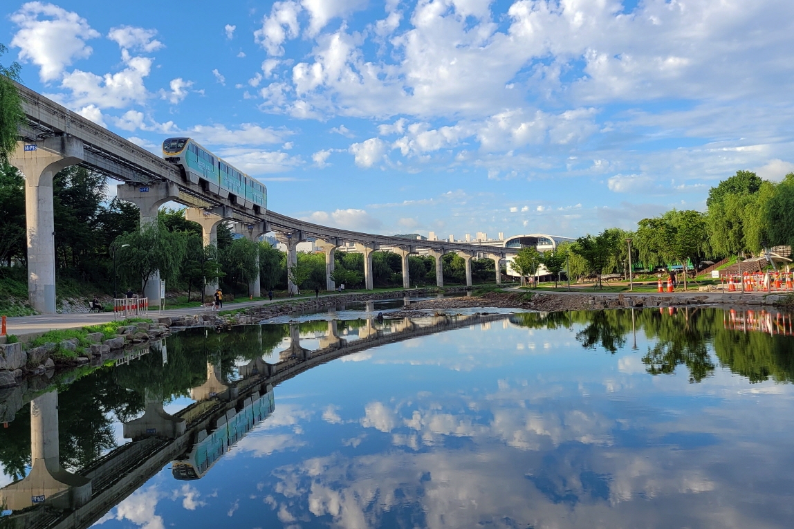 대구3호선 지상철이 팔거천 위를 달릴 때 반영이 아주 멋지게 나타났습니다.